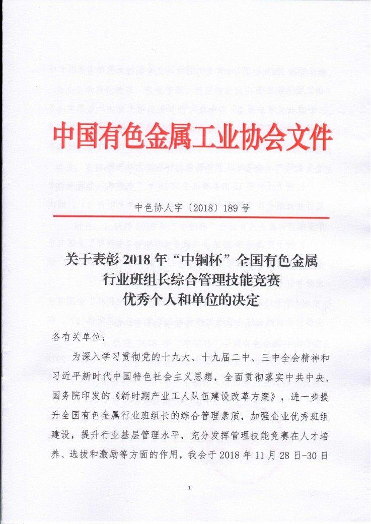 关于表彰2018年“中铜杯”全国有色金属行业班组长综合管理技能竞赛优秀个人和单位的决定
