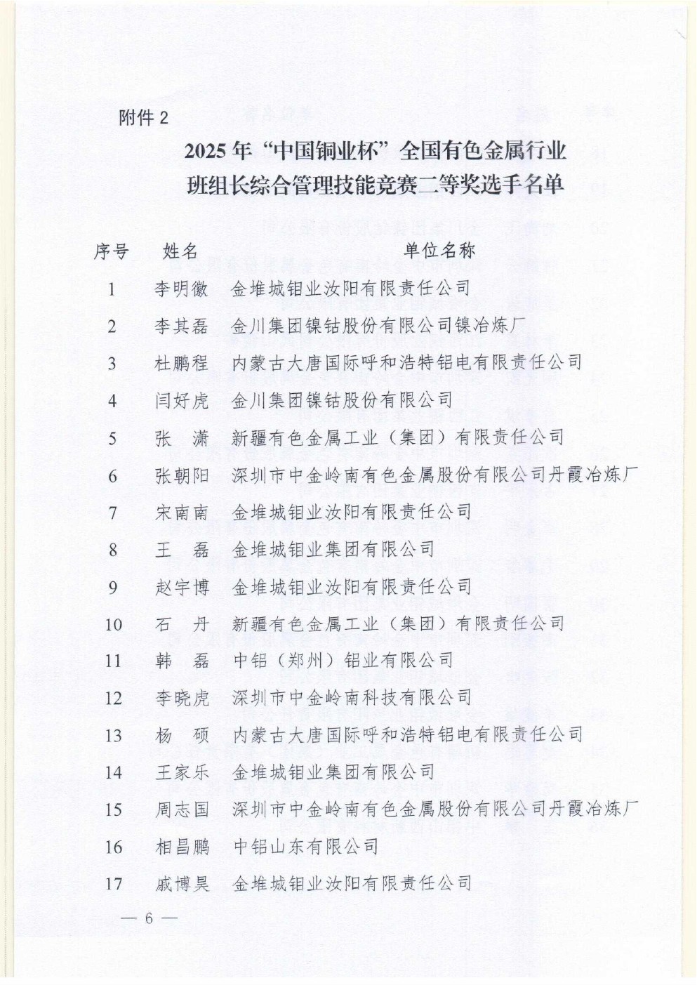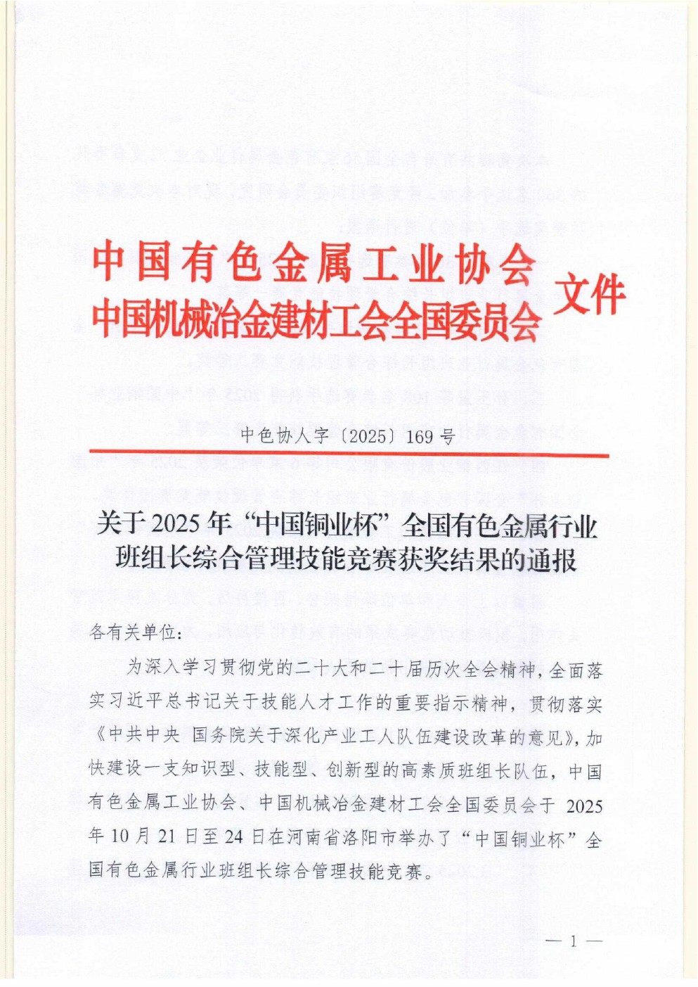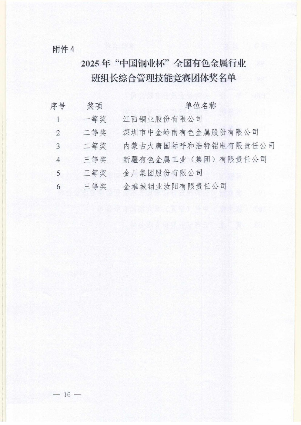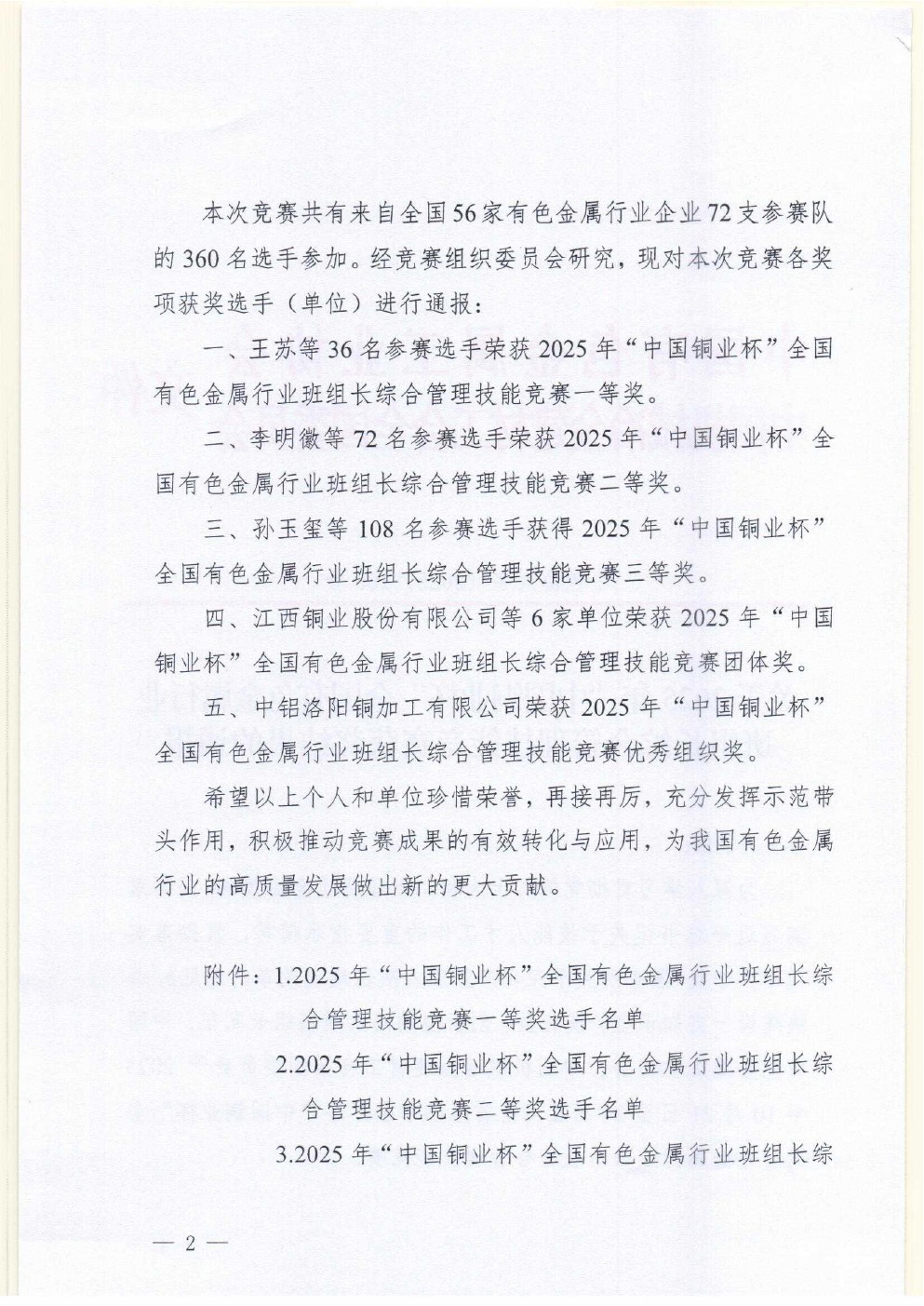 关于2025年“中国铜业杯”全国有色金属行业班组长综合管理技能竞赛获奖结果的通报